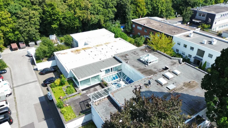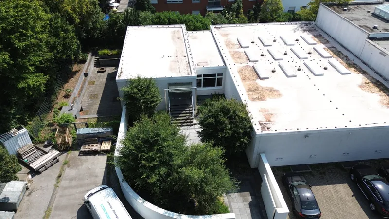 Auf der Dachfläche (Betondecke) des mittleren Gebäudeteils (ca.370m² Fläche) ließe sich ggf. zusätzlicher Wohnraum herstellen. aufgrund der grundsätzlichen 2-Geschossigkeit in der Nachbarschaft; eine Bauvoranfrage wurde noch nicht gestellt.