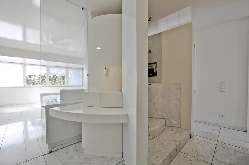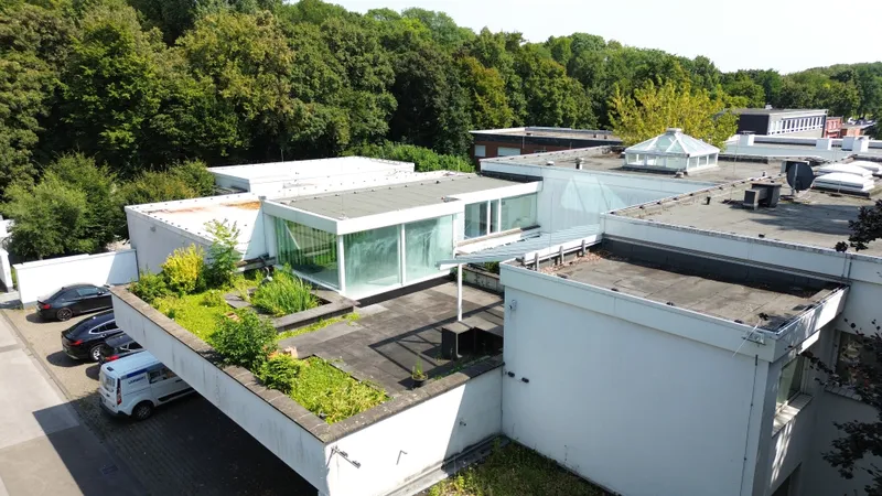 Der mittlere und größte Gebäudeteil stammt ursprünglich aus 1969 (wurde 2003 üppig saniert) und dient derzeit als Empfang, Ausstellung und Büroeinheit sowie weiteren hochwertigen Büroflächen im Obergeschoss.