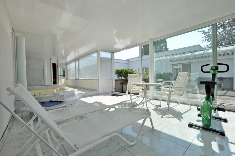 Straßenseits befindet sich das unterkellerte 5 bis 6 - Familienhaus (das Penthouse lässt sich auch in 2 Wohneinheitenaufteilen) aus 1984 (laufend modernisiert) mit einem exklusiven, derzeit leerstehendem Penthouse (ehem. Eigentümerwohnung) mit großer Dachterrasse und Wellness-Sauna-Bereich.