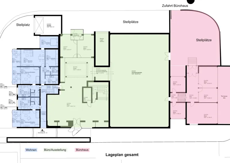 Die weiteren 4 Wohnungen sind solide vermietet; die derzeitige Mieteinnahme beträgt pro Jahr ca. EUR 27.240,-; das Penthouse wurde in der Vergangenheit für EUR 36.000,- / Jahr vermietet. Bei Vollvermietung des Wohnhauses mit insgesamt ca. 523m² Wohnfläche werden somit knapp EUR 65.000,- Kaltmiete inkl. großer Garage erzielt. Insgesamt stehen ca. 668 m² Bürofläche, ca. 364m² Ausstellungsfläche und ca. 666m² Lagerfläche zur Verfügung.
